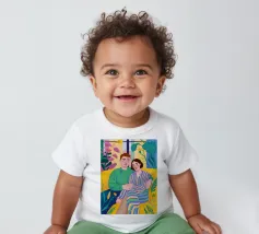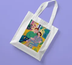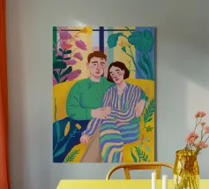 Una commovente illustrazione di una coppia che si accoccola su un divano a righe colorate, con le espressioni soddisfatte, creando una scena d'amore e di conforto.