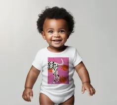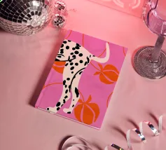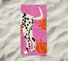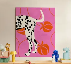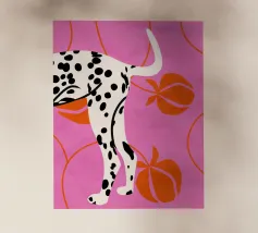 Una stampa d'arte audace e moderna con le zampe posteriori e la coda di un dalmata su un vivace sfondo rosa. Pesche arancioni stilizzate e linee curve aggiungono un tocco astratto e giocoso. Perfetta per gli amanti dei cani e per chi apprezza i disegni grafici unici.