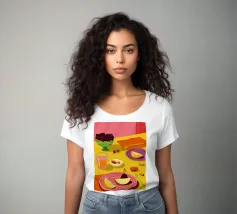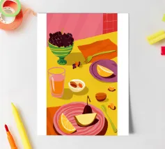 Natura morta di una colazione o di un brunch a due, con piatti di cibo e bicchieri di succo d'arancia su un tavolo giallo. La scena è una rappresentazione semplice, dolce e intima di un pasto condiviso.