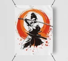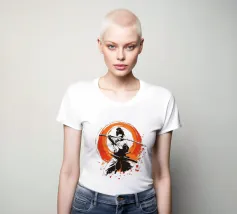 L'essenza della disciplina samurai e del potere estetico: quest'opera, che ricorda stilisticamente le xilografie giapponesi e l'estetica dei manga, si concentra sulla posa dinamica di una donna guerriera. La tavolozza di colori ridotta, composta da nero, bianco e arancione acceso, conferisce alla scena un'intensità drammatica. La pennellata espressiva sullo sfondo, che ricorda un cerchio zen, simboleggia l'illuminazione e la forza, mentre gli schizzi di sangue sul bordo suggeriscono l'implacabile realtà della battaglia. Si tratta di coraggio, determinazione e bellezza.