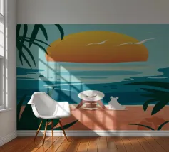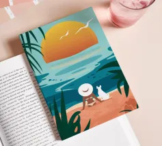 Una scena serena di una persona con un cappello da sole seduta sulla spiaggia con il suo gatto bianco, che guarda il tramonto dorato sull'oceano.