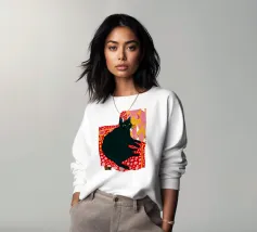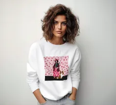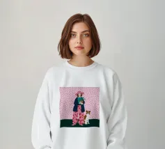 Una donna si trova in una cucina dai colori vivaci con un dalmata al suo fianco, una finestra che mostra una scena all'aperto e vari dettagli della cucina, creando un'illustrazione domestica eccentrica e affascinante.
