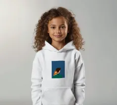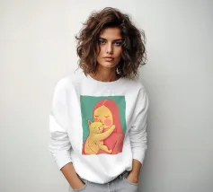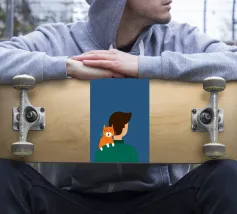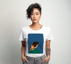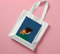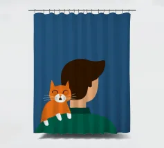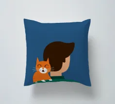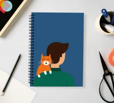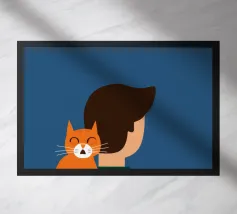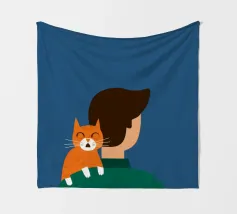 Un'illustrazione semplice e commovente di un piccolo gatto arancione felicemente appollaiato sulla spalla di una persona. La composizione minimalista su uno sfondo blu solido si concentra interamente sul legame affascinante e affettuoso tra una persona e il suo animale domestico.