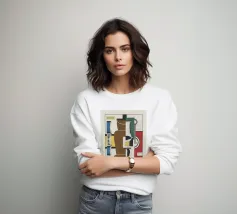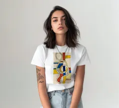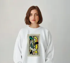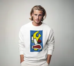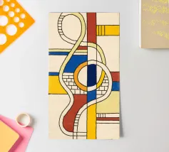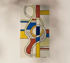 Questo arazzo altamente astratto di Fernand Léger mostra il suo caratteristico uso di forti contorni neri e di audaci colori primari e secondari. La composizione presenta forme spesse e sinuose che ricordano la chiave di violino o la notazione musicale, contrapposte a blocchi di colore e a motivi bianchi simili a mattoni. L'opera riflette l'esplorazione di Léger, durata tutta la vita, della forma pura e del colore.