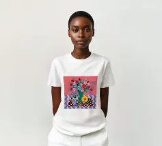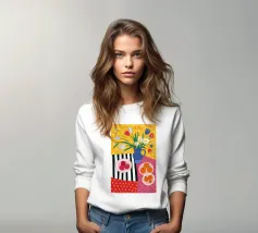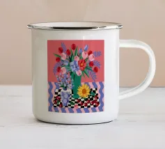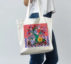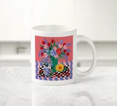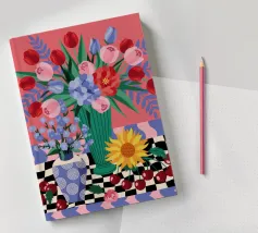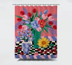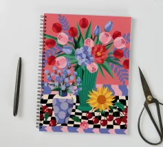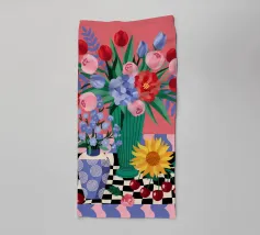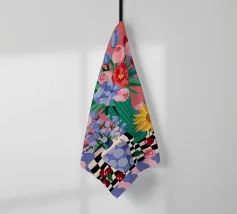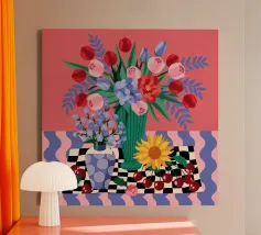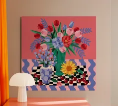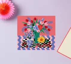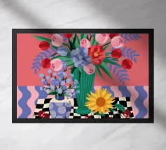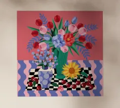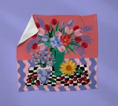 Un vivace bouquet di fiori multicolori si adagia elegantemente in un vaso blu sopra una tovaglia a scacchi. Il mix di tonalità rosa e viola dello sfondo esalta la ricca composizione cromatica.