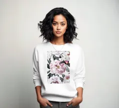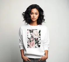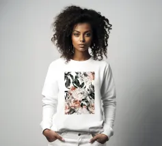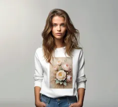Una splendida composizione floreale mette in mostra delicate rose e foglie color pastello, disposte artisticamente su uno sfondo morbido e neutro. La composizione mette in risalto l'eleganza e la maestria.