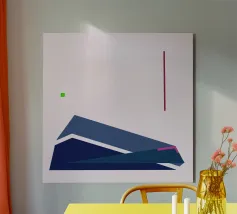 Quest'opera d'arte astratta e minimalista esplora l'equilibrio tra struttura e disturbo. Forme geometriche nitide nei toni freddi del blu sono trafitte da un accento fucsia vivace, creando una tensione visiva che incarna un'energia controllata. La composizione riflette un momento di impulso interiore che rompe l'ordine, trasformando il silenzio in ritmo.