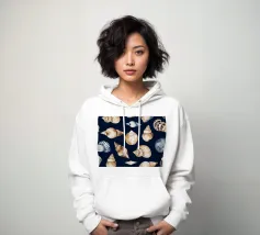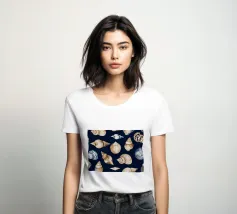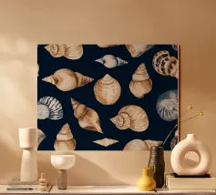 Un motivo di conchiglie vibrante ed elegante, caratterizzato da una varietà di forme di conchiglie a conchiglia, nautilus e spirale nei caldi marroni sabbiosi, avorio cremoso e blu tenue, che si stagliano drammaticamente su un profondo sfondo di mezzanotte. Questa composizione a tema costiero bilancia la raffinatezza con l'estrosità della spiaggia, ideale per tessuti, arte da parete o decorazioni di ispirazione nautica.