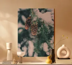 Questo suggestivo motivo mostra rami di abete innevati con pigne dettagliate, creando un'atmosfera invernale armoniosa e naturale. La palette di colori tenui e i dettagli intricati rendono questo disegno una scelta senza tempo. Perfetto come murale, tazza, cover per cellulare o cuscino, questo motivo porta la tranquillità della foresta e la bellezza della natura in ogni casa. Ideale per gli amanti della natura e dell'arte invernale minimalista.