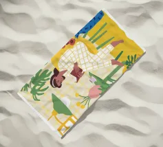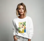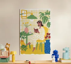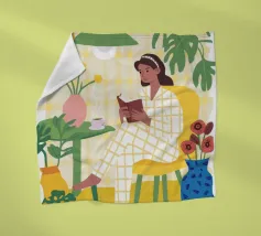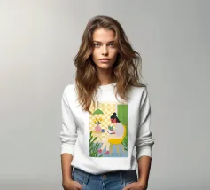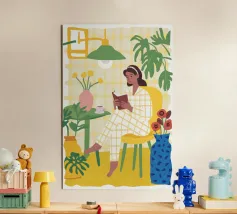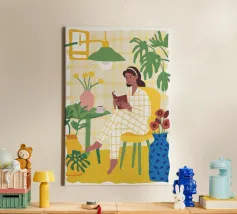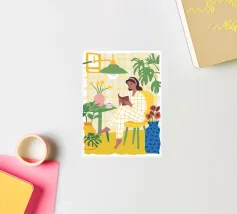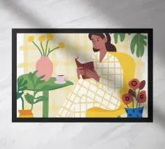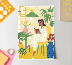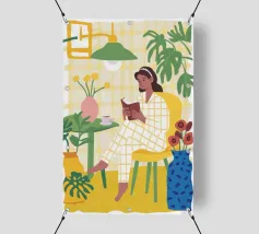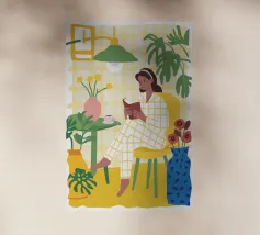 Una donna si gode un momento di tranquilla contemplazione con un drink in un caffè illuminato dal sole. La luce calda, il vestito a scacchi e le piante circostanti creano una scena serena ed elegante di vita quotidiana.
