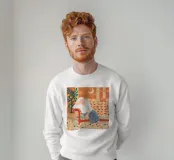 Questa opera d'arte mostra una persona con i capelli bianchi, seduta e in riposo in un ambiente caldo e piastrellato. Lo sfondo comprende una pianta in vaso e forme astratte, creando una scena pacifica e riflessiva.