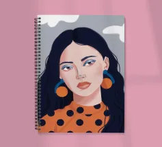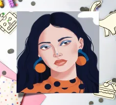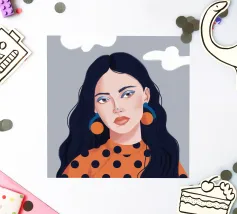 Un ritratto accattivante di una donna con straordinari occhi azzurri, lunghi capelli scuri e grandi orecchini a cerchio. Indossa un vivace top arancione con pois neri, creando un bellissimo contrasto cromatico che mette in risalto i suoi lineamenti.