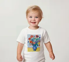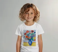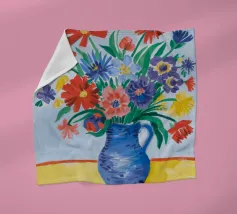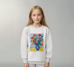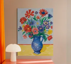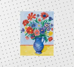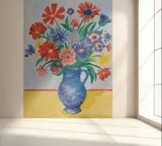 Un ricco e vibrante bouquet di fiori misti, tra cui papaveri rossi e fiordalisi blu, in un classico vaso blu. La composizione è piena e abbondante su uno sfondo blu chiaro, che celebra la bellezza di un raccolto di fiori selvatici.