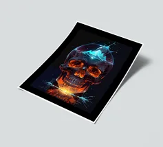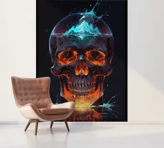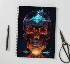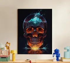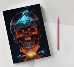 Una vibrante rappresentazione di un teschio dal cuore infuocato, in contrasto con un gelido paesaggio montano alla sua sommità, come se fosse racchiuso in un guscio traslucido. La giustapposizione di fuoco e ghiaccio crea un effetto visivo di grande impatto, sottolineando i temi della dualità e dell'equilibrio. Lo sfondo scuro accentua ulteriormente i colori vivaci e l'energia dinamica della scena.