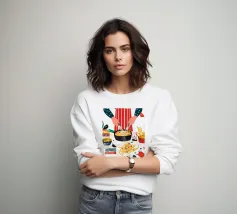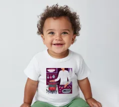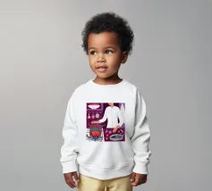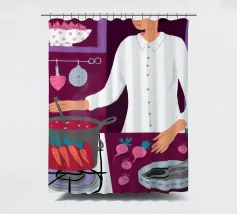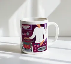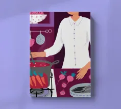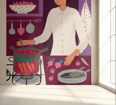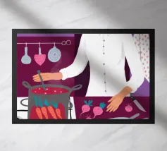 Illustrazione di una persona che cucina con gioia ai fornelli, mescolando una grande pentola rossa. La scena è una rappresentazione calda, vibrante e felice dell'amore per la cucina e della creazione di deliziosi pasti a casa.