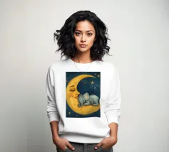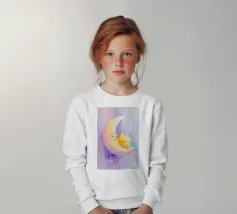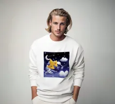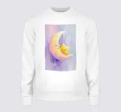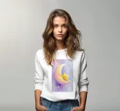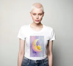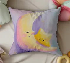 Una luna dipinta a mano a guazzo abbraccia una piccola stella, entrambe sorridono dolcemente. I toni pastello e le texture delicate creano una cameretta sognante e rilassante con uno sfondo pulito e pastello.