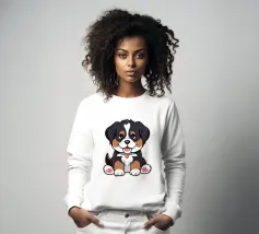 L'immagine raffigura un adorabile cane in stile cartone animato con una espressiva pelliccia bianca e marrone, grandi occhi rotondi e un'espressione allegra. Il cane indossa un collare marrone con una targhetta circolare con la scritta "AHI". Sul corpo ha un disegno unico di vortici e motivi che aggiungono un tocco di creatività. Seduto in posizione eretta, il cane è raffigurato accanto a un osso giocattolo marrone chiaro, che sottolinea la sua natura giocosa. Lo sfondo è bianco e conferisce all'illustrazione un aspetto pulito e minimalista.