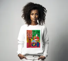 Una scena vibrante ed energica di una donna che cucina in una cucina piena di colori e di piante rigogliose. L'opera è una celebrazione gioiosa e massimalista della creatività e della passione per la cucina.