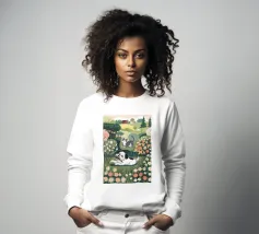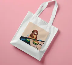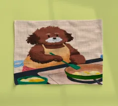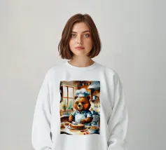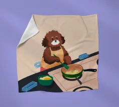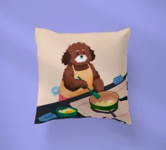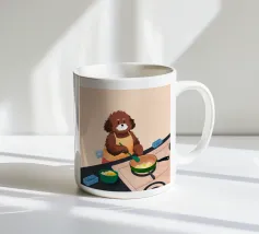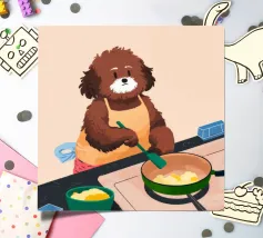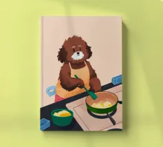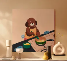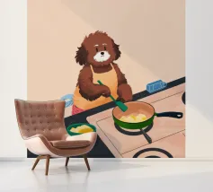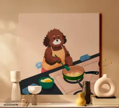 Un cane antropomorfo agita una pentola sui fornelli, circondato da verdure fresche. La calda rappresentazione celebra la gioia e l'armonia della cucina.