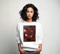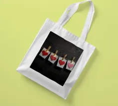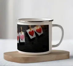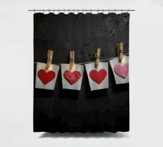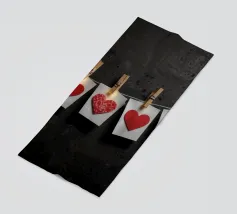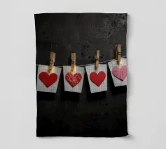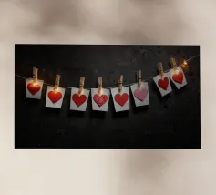 Un filo ornato da ritagli a forma di cuore in varie tonalità di rosso è appeso su uno sfondo scuro. Morbide luci calde illuminano i cuori, creando un'atmosfera romantica per San Valentino.