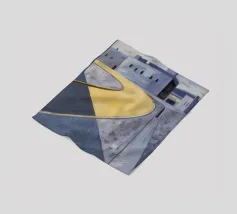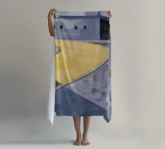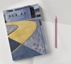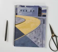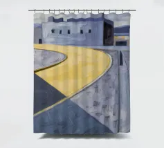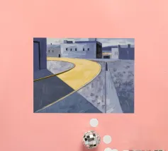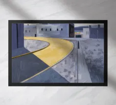 Un sentiero giallo brillante si snoda elegantemente attraverso un paesaggio minimalista di edifici grigi e squadrati. Il dipinto è uno studio sul contrasto dei colori e sulle forme geometriche pulite, che creano una scena urbana serena ma di grande impatto visivo.