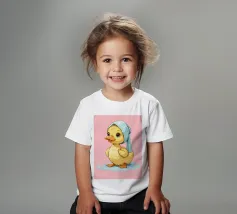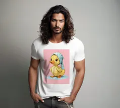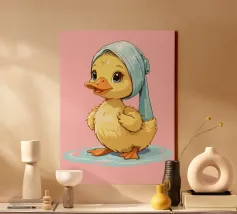 Un simpatico anatroccolo con un foulard blu si trova su una pozzanghera azzurra. L'anatroccolo ha grandi occhi espressivi che gli conferiscono uno sguardo affascinante e accattivante.