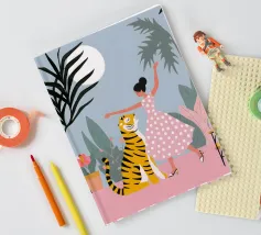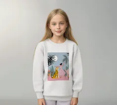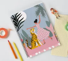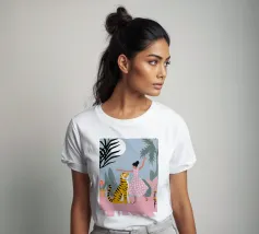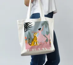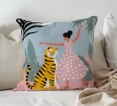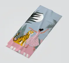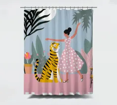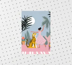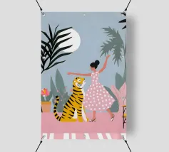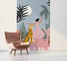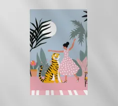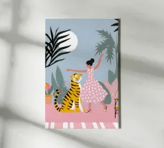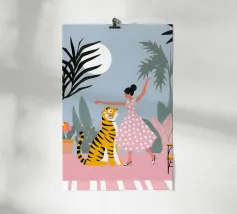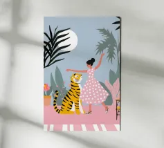 Un duetto stravagante: una donna con un abito a pois balla con una tigre serena sotto un giardino illuminato dalla luna. Moderna e retrò, la scena fonde forza e morbidezza.