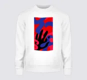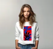 Una composizione astratta audace e drammatica con una forma organica nera su uno sfondo rosso vibrante con un piccolo accento blu. L'opera d'arte è potente, minimalista e di forte impatto grafico.