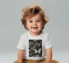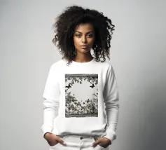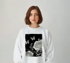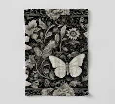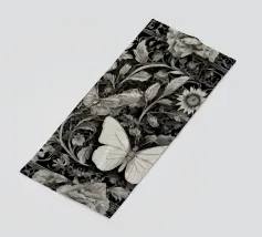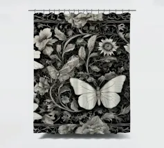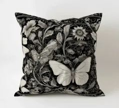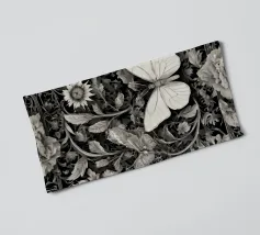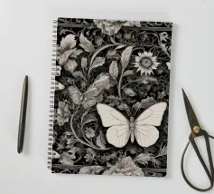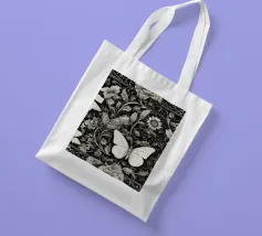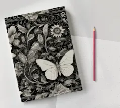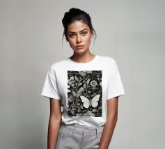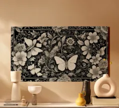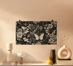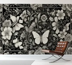 Una composizione floreale dettagliata mostra varie farfalle e fiori con motivi eleganti. Questa opera d'arte monocromatica cattura la bellezza della natura attraverso un design intricato.