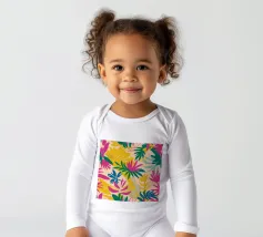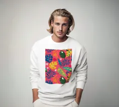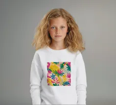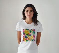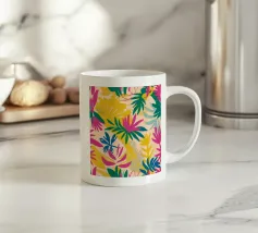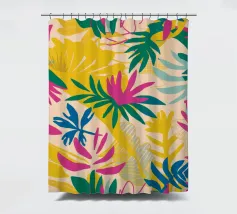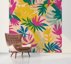 Un motivo vibrante e diffuso di foglie tropicali stilizzate nei toni del giallo, del rosa, del verde acqua e del verde, che crea un'esposizione botanica rigogliosa ed energica.
