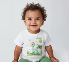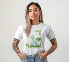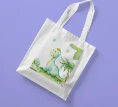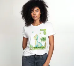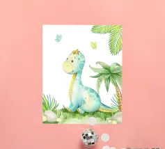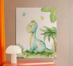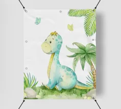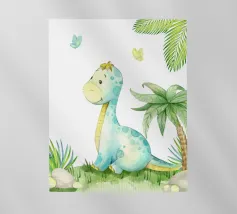 Un simpatico dinosauro blu con pelle maculata siede allegramente su uno sfondo lussureggiante con palme e farfalle. L'ambientazione è luminosa e giocosa e fonde elementi della natura con uno stile stravagante e cartoonesco.