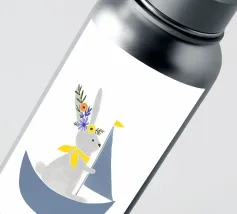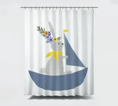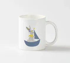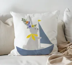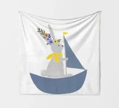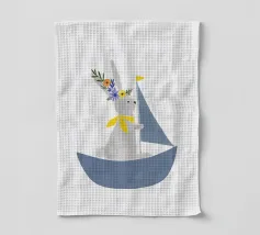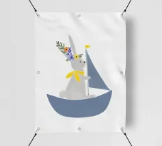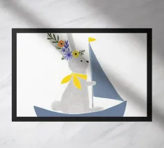Un simpatico coniglietto con corona di fiori galleggia dolcemente in una barca a vela. L'illustrazione minimalista in azzurro e colori pastello porta un'allegra atmosfera marittima nella cameretta. Questa illustrazione fantasiosa combina elementi animali con accenti botanici e fa sorridere tutti.