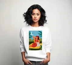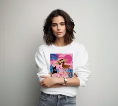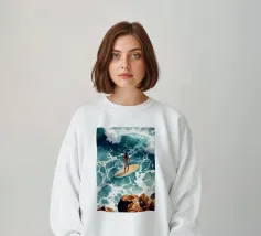 Questa immagine raffigura una donna in bikini rosso che cavalca il dorso di un grosso cane mentre fa surf su un'onda. Lo sfondo è caratterizzato da un tramonto colorato con un cielo sfumato che passa dal blu all'arancione.