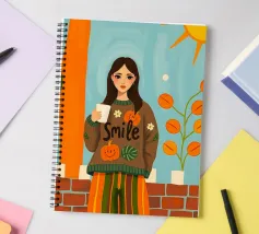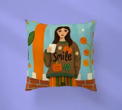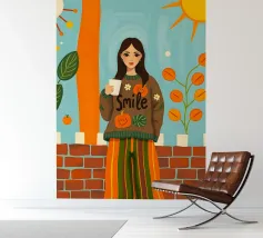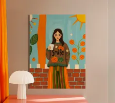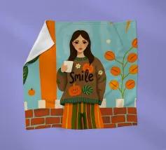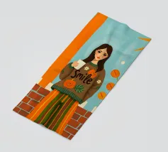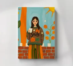Una giovane donna con pantaloni a righe e un grande maglione accogliente che tiene in mano una tazza di caffè durante la stagione autunnale.