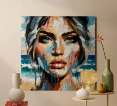 Ritratto di una bella donna in spiaggia con le onde sullo sfondo.