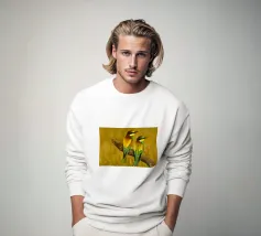 Un dipinto ad inchiostro acrilico raffigurante due gruccioni seduti su un ramo con foglie e fiori rosa. Sono in posizione rilassata ed entrambi guardano a sinistra.