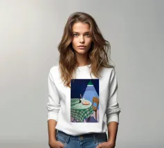 Una giocosa natura morta con due bicchieri di vino e due bottiglie su una tovaglia a scacchi gialli e bianchi. Due sedie verdi sono accostate al tavolo, creando una scena invitante su uno sfondo blu a righe.