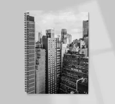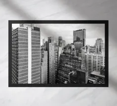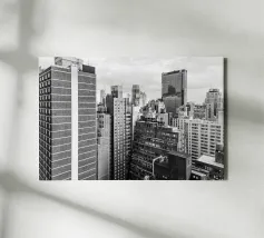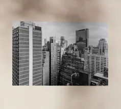 La splendida fotografia in bianco e nero cattura lo skyline di Manhattan, mostrando gli imponenti grattacieli e le loro eleganti facciate in una composizione geometrica da una prospettiva aerea. Con riflessi visibili alla luce del giorno, questo poster di lusso incarna l'arte moderna ed è un'aggiunta elegante agli interni contemporanei.
