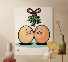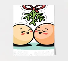 Due adorabili uova dei cartoni animati con le guance arrossate condividono un simpatico momento sotto un rametto di vischio. La didascalia sotto di loro recita "EGG-SNOG" con piccoli cuori ai lati.