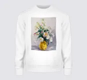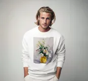 Un vaso dorato contiene un elegante bouquet di fiori bianchi e gialli, probabilmente narcisi o gigli, le cui forme delicate sono rese con un tocco morbido e gentile su uno sfondo freddo e tenue.