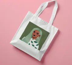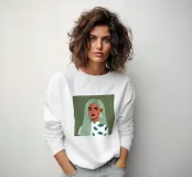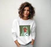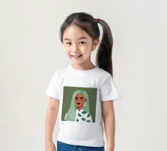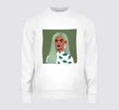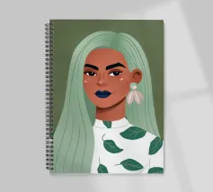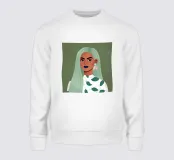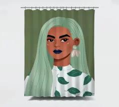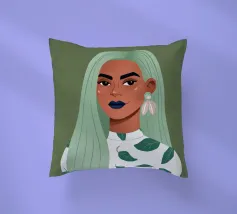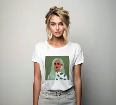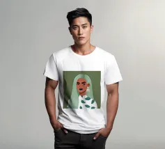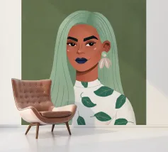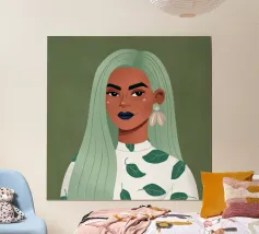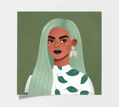 Una persona con lunghi capelli verdi indossa un top bianco con foglie verdi, su uno sfondo verde.