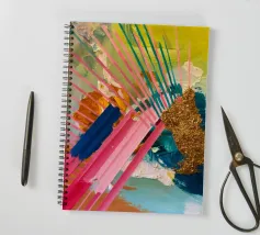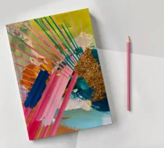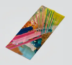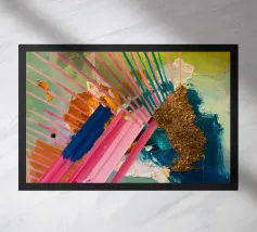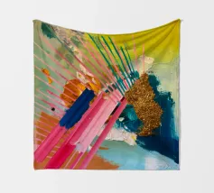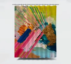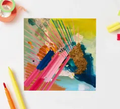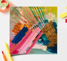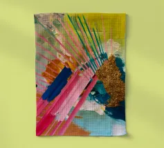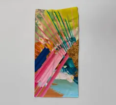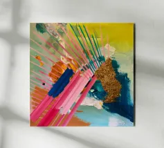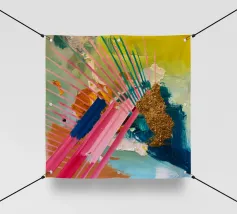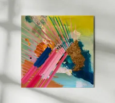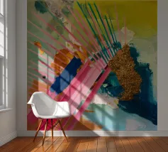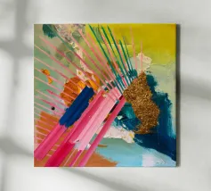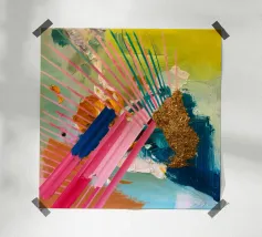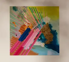 Linee dinamiche a raggiera nei colori rosa, blu, giallo e verde esplodono in questo pezzo astratto, con un'area significativa di materiale dorato strutturato che crea un punto focale di energia scintillante.
