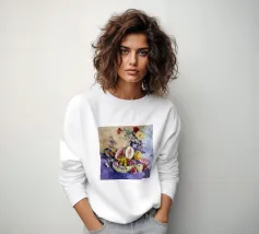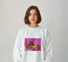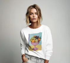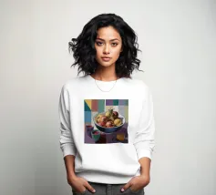 Una natura morta che mostra una brocca di porcellana bianca o una caffettiera accanto a una ciotola piena di uva, mele e pere. La composizione si trova su un drappo viola con uno sfondo tenue.