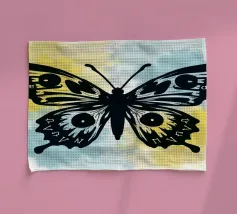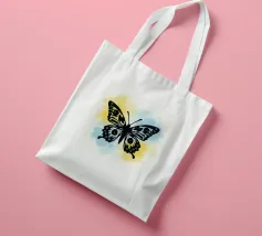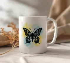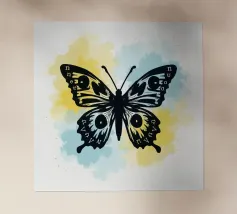 Una farfalla con un raro disegno sulle ali. Sullo sfondo la luce del sole sul lago.