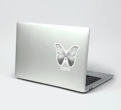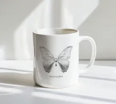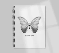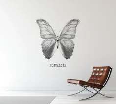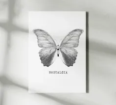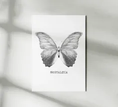 Disegno di farfalla Nostalgia, illustrazione di una farfalla in bianco e nero con caratteri tipografici "nostalgia".