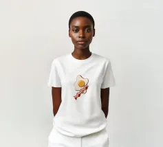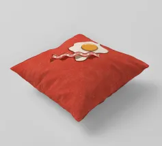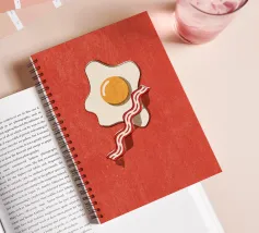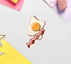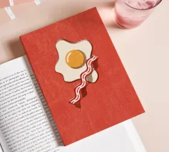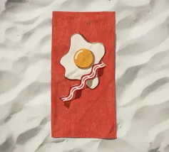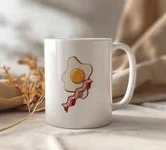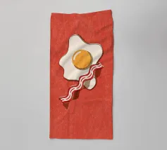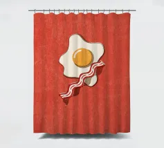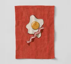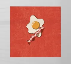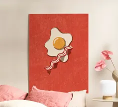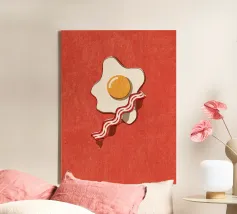 Un affascinante disegno di ispirazione retrò mostra un uovo fritto e una fetta di bacon croccante su un vivace sfondo rosso. Il design minimalista con linee pulite e una leggera texture vintage conferisce all'immagine un'atmosfera nostalgica che ricorda la classica cultura americana della colazione. Perfetto per gli appassionati di estetica retrò e ideale come elemento decorativo in cucina o in sala da pranzo.