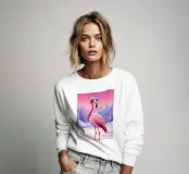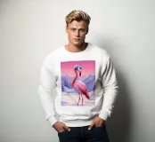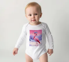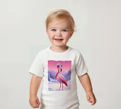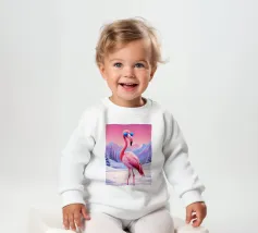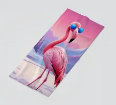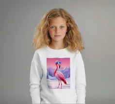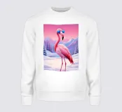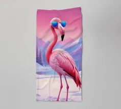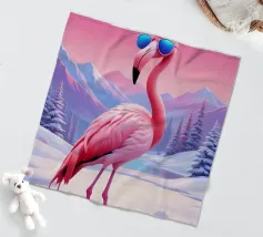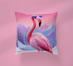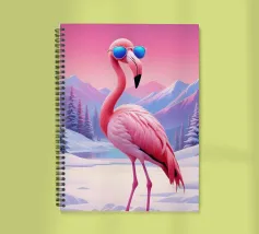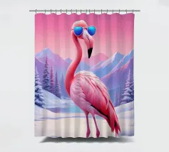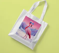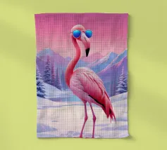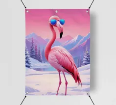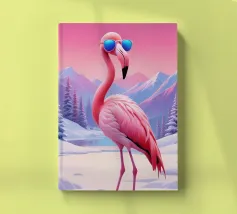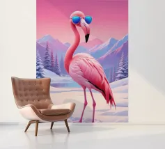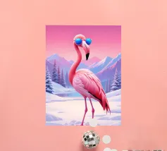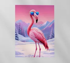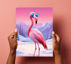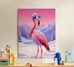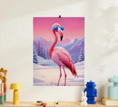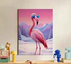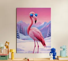 Date alle vostre pareti qualcosa per cui sorridere. Questa opera d'arte audace e stravagante presenta un fenicottero sicuro di sé che si erge fiero in una scena invernale innevata, con tanto di occhiali da sole riflettenti e piume rosa acceso. La vivace palette di colori mescola i caldi toni tropicali con i freddi blu artici, creando un giocoso contrasto visivo che cattura immediatamente l'attenzione.