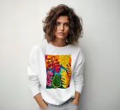 Una composizione intensa ed energica di foglie e forme floreali sovradimensionate in una tavolozza infuocata di rosso, arancio e fucsia, contrastata da verdi e blu profondi, che incarna un giardino selvaggio e indomito.