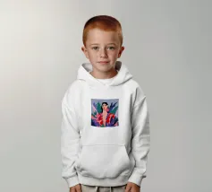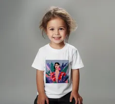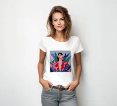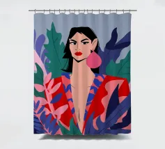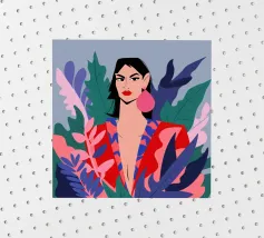 Un ritratto moderno di una donna elegante con un audace rossetto rosso, che indossa una vivace giacca a fantasia fucsia, incorniciata da foglie scure, che emana sicurezza.