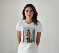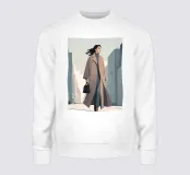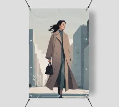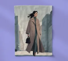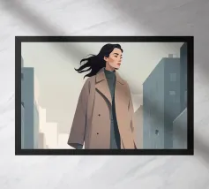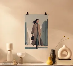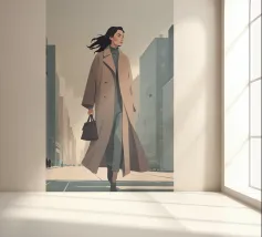 Una donna elegante cammina in un ambiente urbano sobrio, con il cappotto che scorre e la borsetta in mano. I toni calmi e la luce delicata sottolineano l'indipendenza e lo stile sicuro di sé.